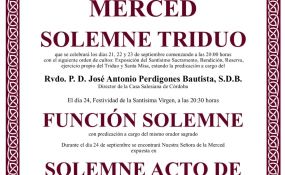 El próximo martes dará comienzo, el SOLEMNE TRIDUO que nuestra Hermandad consagra anualmente a su venerada Titular, Santa María de la Merced. Se celebrará los días 21, 22 y 23 de septiembre de 2021, comenzando a las 20,00 horas con el siguiente orden de cultos: Exposición del Santísimo Sacramento, Bendición, Reserva, ejercicio