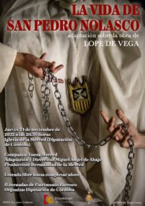 Tras el éxito de las dos funciones que tuvieron lugar el pasado 21 de octubre en la Parroquia de San Antonio de Padua, «La vida de San Pedro Nolasco» de Lope de Vega volverá a representarse por la compañía «Vuesa Merced», perteneciente a la Hermandad, el jueves 24 de noviembre a las 20.30 h. en la Iglesia de la Merced, dentro de las Segundas Jornadas de Patrimonio Barroco que organiza la Diputación Provincial de Córdoba.