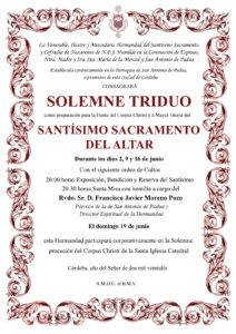El próximo jueves 16 de junio, tendrá lugar el tercer día del Solemne Triduo al Santísimo Sacramento del Altar con el siguiente orden de Cultos: